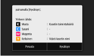 Tietoa jäljellä olevan väriaineen määrästä ei voi tunnistaa oikein. Muu kuin Canon-väriainekasetti tai väärän niminen väriainekasetti voi olla asetettu. Käytä tätä kasettia painamalla [Hyväksyn]. Virheen lähde