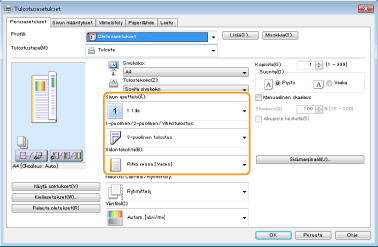 [Sivujärjestys] [1-puolinen/2-puolinen/Vihkotulostus] [Sidontakohta].