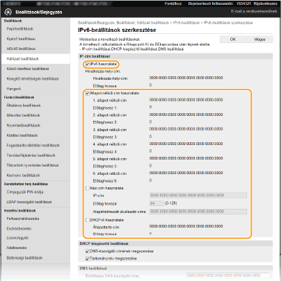 A készülék IPv6-címei a Távoli felhasználói felületen konfigurálhatók. Az IPv6-címek beállítása előtt ellenőrizze az IPv4-cím beállításait (IPv4-beállítások megtekintése). Az IPv6-címek használatához szükség van az IPv4-beállítások helyes megadására. A lapolvasó-illesztőprogramot vagy MF Scan Utility programot használó beolvasási funkció nem érhető el IPv6-környezetben. A készülék több IPv6-címet használhat, még pedig a következőket: