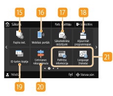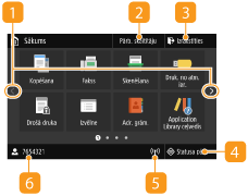Izvēlieties, lai pārbaudītu drukāšanas statusu, skatītu lietojuma vēsturi vai dažādus tīkla iestatījumus, piemēram, iekārtas IP adresi. Varat arī skatīt iekārtas statusu, piemēram, atlikušo papīra un tonera daudzumu vai kļūdas. Ekrāns <Statusa pārr.>