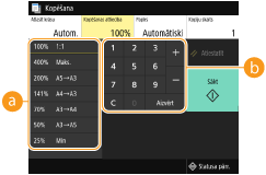 Varat palielināt vai samazināt kopiju izmēru, izmantojot iepriekš iestatītu kopēšanas koeficientu, piemēram, <A5->A4>, vai iestatot pielāgotu kopēšanas koeficientu ar 1% soli.