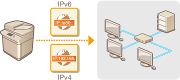 Lai savienotu iekārtu ar tīklu, ir nepieciešama unikāla tīkla IP adrese. Ir pieejamas divas IP adrešu versijas: IPv4 un IPv6. Konfigurējiet šos iestatījumus atkarībā no tīkla vides. Lai izmantotu IPv6 adreses, ir pareizi jākonfigurē IPv4 adreses iestatījumi.