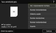 Format papieru można określić jako <Rozmiar niestandardowy>, co eliminuje konieczność wprowadzenia ustawienia formatu papieru. Opcję <Rozmiar niestandardowy> należy określić w przypadku ładowania papieru nieznanego formatu w celu użycia do kopiowania lub gdy fomat papieru jest już zarejestrowany w sterowniku drukarki.