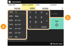Istnieje możliwość powiększania lub zmniejszania kopii poprzez użycie wcześniej ustawionego współczynnika kopiowania, takiego jak <A5->A4>, lub ustawienie niestandardowego współczynnika kopiowania (z dokładnością do 1 %).