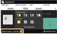 Kiedy toner wyczerpał się lub zaczyna go brakować, zostanie wyświetlony komunikat z informacją o konieczności przygotowania nowego zasobnika z tonerem lub wymiany zasobnika z tonerem. Przygotuj nowy zasobnik z tonerem lub wymień go zgodnie z wyświetlanym komunikatem.