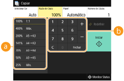 Pode ampliar ou reduzir cópias utilizando um rácio de cópia predefinido, como <A5->A4>, ou definindo um rácio de cópia personalizado em incrementos de 1%.
