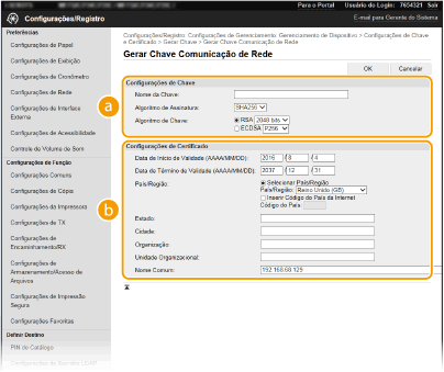 Se selecionar [SHA384] ou [SHA512] em [Algoritmo de Assinatura], não é possível selecionar [512 bits] como comprimento da chave quando seleciona [RSA] em [Algoritmo de Chave].