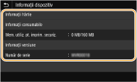 Când selectaţi <Monitor stare>, se afişează un ecran în care puteţi verifica progresul documentelor, precum şi starea aparatului (nivelul de toner disponibil în cartuşe etc.) şi setările de reţea, cum ar fi adresa IP a aparatului.