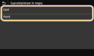 Selectaţi dacă imprimarea este efectuată conform setărilor driverului de imprimantă pentru formatul şi tipul de hârtie, care au prioritate în faţa setărilor configurate tava multifuncțională din meniul <Setări hârtie> de pe ecranul principal. Selectând <Pornit>, puteţi imprima de la sursa de hârtie specificată în driverul de imprimantă, indiferent de setările pentru hârtie de pe aparat.