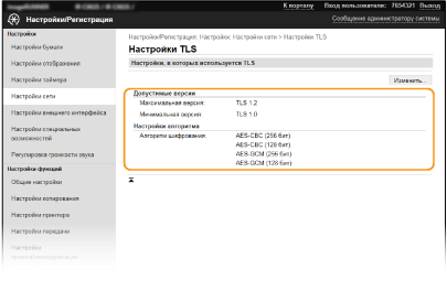 Можно выполнять шифрование для обмена данными между аппаратом и веб-браузером на компьютере, используя протокол TLS (безопасность транспортного уровня). TLS — это способ шифрования данных, отправляемых или получаемых по сети. Протокол TLS должен быть включен при использовании Удаленного ИП для указания настроек IPSec (Способ защищенного общего ключа), аутентификации с помощью IEEE 802.1X (TTLS/PEAP) или SNMPv3. Чтобы использовать связь с шифрованием TLS для Удаленного ИП, необходимо указать ключ и сертификат (сертификат сервера), которые необходимо использовать, перед включением TLS. Перед использованием TLS создайте или установите ключ и сертификат TLS (