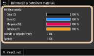 Preostalo količino potrošnega materiala lahko preverite v vmesniku Remote UI (Oddaljeni uporabniški vmesnik). Zaslon vmesnika Remote UI (Oddaljeni uporabniški vmesnik)
