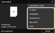 Du kan ange pappersformatet som <Fri storlek> och då behöver du inte välja pappersformatsinställning. Ange <Fri storlek> när du fyller på papper av okänt format för kopiering eller om pappersformatet redan har registrerats i skrivardrivrutinen.