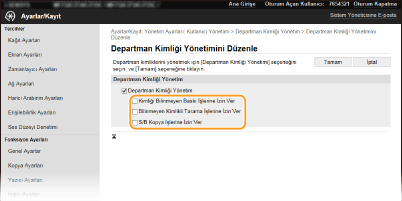 Bilgisayardan Yapılan İşler için Departman Kimliği Yönetimini Etkinleştirme). Ancak bu ayar için onay kutusu seçilmişse, kimlik ve PIN girilmeden de işler yürütülebilir. Doğru departman kimliği ve PIN girilmediği sürece hiçbir işin yürütülmemesi sağlayacak bir ayar yapılandırmak istiyorsanız, onay kutusunu temizleyin.