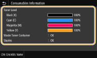 Щоб перевірити залишок тонера в картриджах, використаного тонера в картриджі та скоб, виконайте описану нижче процедуру.