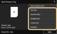 באפשרותך להגדיר את גודל הנייר כ-<Free Size>, דבר שמבטל את הצורך להזין את הגדרת גודל הנייר. ציין <Free Size> בעת טעינת נייר בגודל לא ידוע לשימוש בהעתקה או כאשר גודל הנייר כבר רשום במנהל המדפסת.