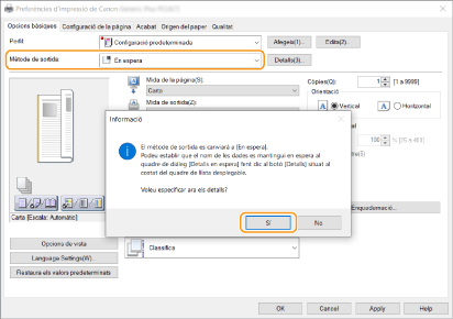 Seleccioneu [En espera] des del [Mètode de sortida] i feu clic a [Sí].