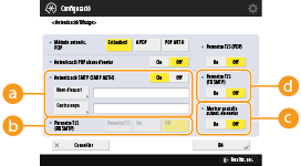 Per codificar la comunicació dirigida a i procedent del servidor SMTP utilitzant TLS, premeu <On>. Quan està establerta l'opció <On>, podeu confirmar el certificat de servidor TLS durant la comunicació amb el servidor i afegir CN als elements de verificació. <Confirmar certificat de TLS per env. SMTP>