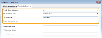 2 | Impostare la modalità di comunicazione e il numero di fax (o l'URI). ![]() |