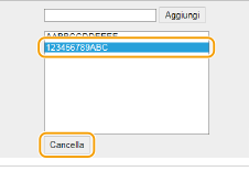 2 | Specificare eccezioni di indirizzo. Immettere l'indirizzo MAC nella casella di testo [Indirizzo da registrare] e fare clic su [Aggiungi]. Non è necessario delimitare gli indirizzi con trattini o due punti. ![]() Verificare errori immissione Se gli indirizzi MAC sono immessi in modo non corretto, potrebbe non essere possibile accedere alla macchina dalla IU remota; in questo caso è necessario impostare <Filtro indirizzi MAC> su <Off>. <Filtro indirizzi MAC> ![]() Quando si seleziona [Rifiutare] per un filtro in uscita I pacchetti in uscita multicast e broadcast non possono essere filtrati. Eliminazione di un indirizzo MAC dalle eccezioni Selezionare un indirizzo MAC e fare clic su [Cancella]. ![]() | ||||