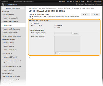 Para restringir los datos enviados desde el equipo a un ordenador, seleccione [Filtro de salida]. Para restringir los datos recibidos desde un ordenador, seleccione [Filtro de entrada].