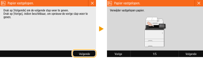 In sommige gevallen worden, wanneer er een fout optreedt, instructies weergegeven over hoe u moet reageren. Volg de aanwijzingen op het scherm voor het oplossen van het probleem. Het scherm dat wordt weergegeven wanneer er zich een papierstoring voordoet, wordt hieronder getoond als voorbeeld.