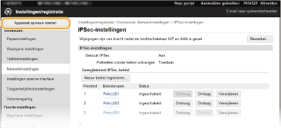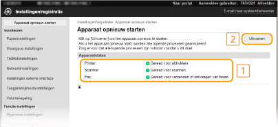 Als er bepaalde instellingen zijn aangepast, moet u de veranderingen misschien effectief maken door het apparaat opnieuw te starten. Dit gedeelte beschrijft hoe u het apparaat opnieuw start.