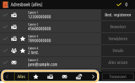 | | U kunt fax-/scanbestemmingen in het Adresboek die u veel gebruikt, registreren en ze gemakkelijk selecteren wanneer u ze nodig hebt ( Bestemmingen opslaan in het adresboek). U kunt naar bestemmingen zoeken op alfabet, uit lijsten in het Adresboek of door driecijferige nummers in te voeren (nummers voor verkort kiezen). U kunt ook bestemmingen sneller opgeven door middel van de volgende functies. |