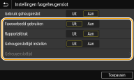 U kunt opgeven of de functie Ontvangst in geheugen slechts een opgegeven tijdsperiode van de dag actief moet zijn. Selecteer <Aan> om de functie Ontvangst in geheugen slechts een in <Geheugenslottijd> opgegeven tijdsperiode van de dag te activeren.