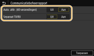 Selecteer <Aan> om afzonderlijke rapporten af te drukken voor verzonden en ontvangen documenten en <Uit> om verzend- en ontvangstgegevens te combineren in één rapport.