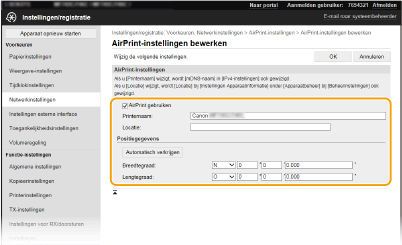 Hiermee kunt u de waarden controleren die zijn ingevoerd in de AirPrint-instellingen, zoals de naam en locatie van het apparaat. U kunt op [Bewerken] klikken om de instellingen te veranderen.