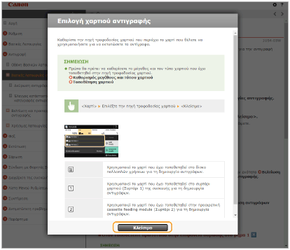 Αν κάνετε κλικ στο εικονίδιο, η τρέχουσα σελίδα μπορεί να σκουρύνει και να εμφανιστεί ένα αναδυόμενο παράθυρο. Για να επιστρέψετε στη σελίδα, κάντε κλικ στο [Κλείσιμο] στο αναδυόμενο παράθυρο.
