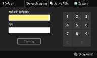Εάν είναι ενεργοποιημένη η διαχείριση μέσω κωδικών τμημάτων ή είναι ενεργοποιημένα τα αναγνωριστικά διαχειριστή συστήματος, πρέπει να συνδεθείτε πριν χρησιμοποιήσετε τη συσκευή. Πρέπει, επίσης, να συνδεθείτε εάν η χρήση των λειτουργιών φαξ και σάρωσης είναι περιορισμένη.