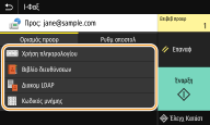 Αν στο γραφείο σας υπάρχει εγκατεστημένος διακομιστής LDAP, μπορείτε να καθορίσετε έναν προορισμό χρησιμοποιώντας τα στοιχεία χρήστη στον διακομιστή. Προσπελάστε τον διακομιστή LDAP μέσω της συσκευής για να αναζητήσετε τα κατάλληλα στοιχεία χρήστη και να τα καθορίσετε ως προορισμό.
