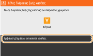 Εάν εμφανιστεί ένα μήνυμα ενώ η συσκευή λαμβάνει ένα φαξ/I-Φαξ ή ενώ έχετε επιλέξει να γίνεται αυτόματη εκτύπωση των αναφορών, τα ληφθέντα φαξ/I-Φαξ και οι αναφορές θα αποθηκευτούν στη μνήμη, έτσι ώστε να μην ξεθωριάζουν μετά την εκτύπωσή τους. Για να συνεχίσετε να εκτυπώνετε ακόμη και όταν κοντεύει να εξαντληθεί ο γραφίτης, ορίστε τη ρύθμιση <Συνέχ. εκτύπ. Με χαμ. στάθμη> στην επιλογή <On>. <Συνέχ. εκτύπ. Με χαμ. στάθμη>