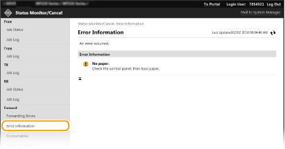 Όταν έχετε συνδεθεί σε λειτουργία υπεύθυνου συστήματος, μπορείτε να κάνετε κλικ στο [Job Number] για να εμφανίσετε αναλυτικές πληροφορίες ή να κάνετε προεπισκόπηση του εγγράφου του οποίου απέτυχε η προώθηση.