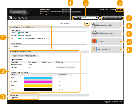 Når du logger ind på Brugerinterface til fjernbetjening, vises følgende portalside. I dette afsnit beskrives de emner, der vises på portalsiden og de grundlæggende handlinger.