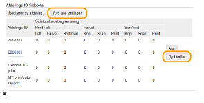 Nulstil optællingerne ved at klikke på det tilsvarende tekstlink under [Afdelings-ID], og klik derefter på [Ryd tæller]  [OK]. Nulstil alle optællingerne for alle afdelings-id'er ved at klikke på [Ryd alle tællinger]  [OK]. Brug af kontrolkortNår Copy Card Reader-F (valgfrit) tilsluttes til maskinen, registreres afdelings-id'erne automatisk. Undlad at slette de registrerede afdelings-id'er. De kontrolkort, der svarer til de slettede afdelings-id'er vil være utilgængelige. Du kan ikke bruge [Begræns funktioner] til at begrænse det tilladte antal udskrivningssider. |