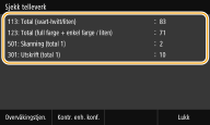 Du kan kontrollere separate totalsummer for antall sider brukt til fargeutskrifter og svart-hvitt-utskrifter. Disse totalsummene inkluderer fakser, rapporter og lister i tillegg til kopier og utskrifter av data fra datamaskiner.