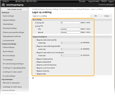Registrer en avdelings-ID, og angi en PIN-kode for den. Registrer alle avdelings-ID-ene som skal administreres.
