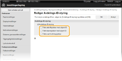 Aktivere avdelings-ID-styring for jobber fra datamaskinen). Hvis det imidlertid er merket av i boksen for denne innstillingen, utføres jobbene selv hvis ID og PIN-kode ikke er skrevet inn. Når du vil konfigurere en innstilling slik at ingen jobber uføres uten at korrekt avdelings-ID og PIN-kode skrives inn, fjernet du merket i boksen.