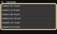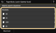 Kun oletuspaperiasetus on tallennettu, paperiasetusnäyttöä ei näytetä, kun paperia lisätään, ja samaa asetusta käytetään aina. Jos lisäät erilaista paperikokoa tai -tyyppiä vaihtamatta paperiasetuksia, laite ei ehkä tulosta oikein. Voit välttää tämän ongelman valitsemalla <Määritä paperin lataaminen> vaiheessa 3 ja lisäämällä sitten paperin. |