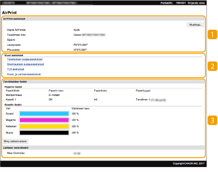 Voit avata AirPrint-toiminnon näytön, jossa voit käyttää AirPrint-asetuksia ja myös katsoa tietoja tarvikkeista, kuten paperi ja väriainekasetti. Voit myös määrittää suojaustoiminnon asetukset.