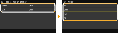 Valitse sivunkuvauskieli, jotta laite voidaan havaita tulostimena, joka on yhteensopiva kyseisen kielen kanssa, kun se yhdistetään tietokoneeseen kytke ja käytä -toiminnolla.