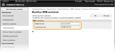 | | SMB (Server Message Block) on protokolla, jolla jaetaan resursseja, kuten tiedostoja ja tulostimia, useamman kuin yhden verkossa olevan laitteen kanssa. Laite käyttää SMB-protokollaa skannattujen asiakirjojen tallentamiseen jaettuun kansioon. Verkosta riippuen voit joutua asettamaan NetBIOS-nimen ja työryhmän nimen. |