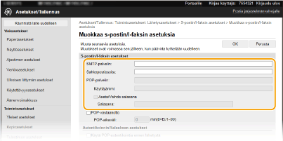 Käytä etäkäyttöliittymää lähetys- ja vastaanottoasetusten määrittämiseen, kuten laitteen käyttäminen I-faksien lähetykseen ja vastaanottoon ja POP-todennukseen ja tiedonsiirron salaamiseen ennen sähköpostin tai I-faksien lähettämistä. Lisätietoja vaadituista asetuksista saat Internet-palveluntarjoajaltasi tai verkon pääkäyttäjältä.