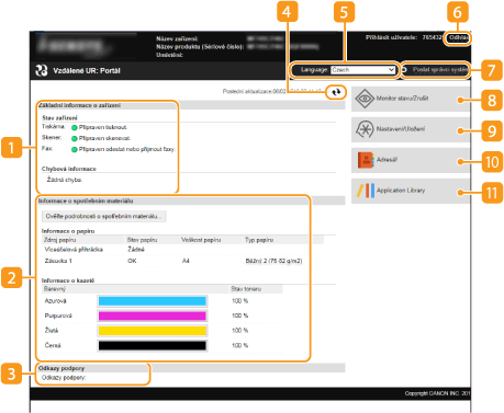 Když se přihlásíte do Vzdáleného uživatelského rozhraní, objeví se následující stránka portálu. V této části jsou popsány položky zobrazené na stránce portálu a základní operace.