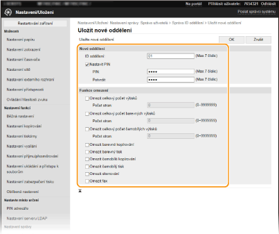 Uložte ID oddělení a nastavte pro ně kód PIN. Uložte všechna ID oddělení, která chcete spravovat.