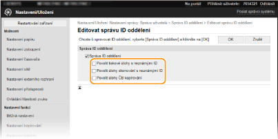 Zaškrtnutím políčka aktivujte správu ID oddělení. Pokud funkci správy ID oddělení nechcete dále používat, zrušte zaškrtnutí políčka.