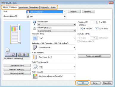Vyberete ovladač tiskárny pro daný stroj a klikněte na tlačítko [Předvolby] nebo [Vlastnosti].