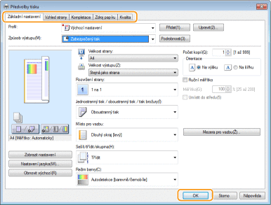 Vyberete ovladač tiskárny pro daný stroj a klikněte na tlačítko [Předvolby] nebo [Vlastnosti].